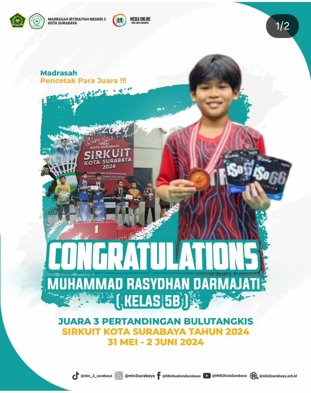 | MUHAMMAD RASYDHAN DARMAJATI | 0129648615 | Juara 3 Pertandingan Bulu Tangkis Sirkuit Kota Surabaya | Tingkat Kota | 2024 | Foto | |