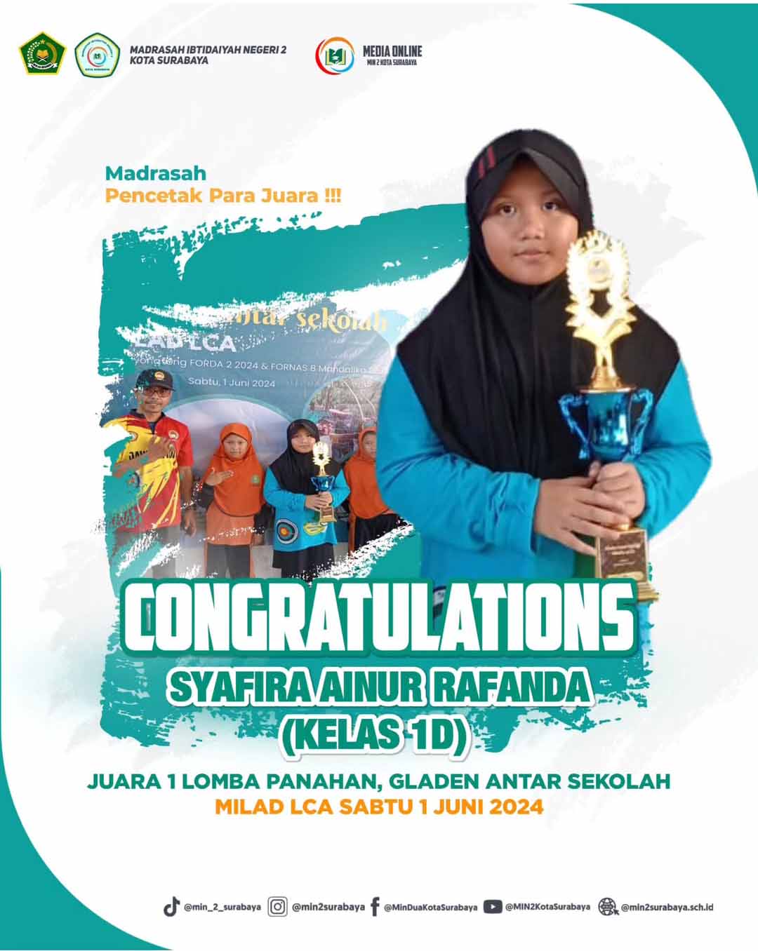 | SYAFIRA AINUR RAFANDA | 3166985197 | Juara 1 Lomba Panahan, Gladen Antar Sekolah | Tingkat Kota | 2024 | Foto | |