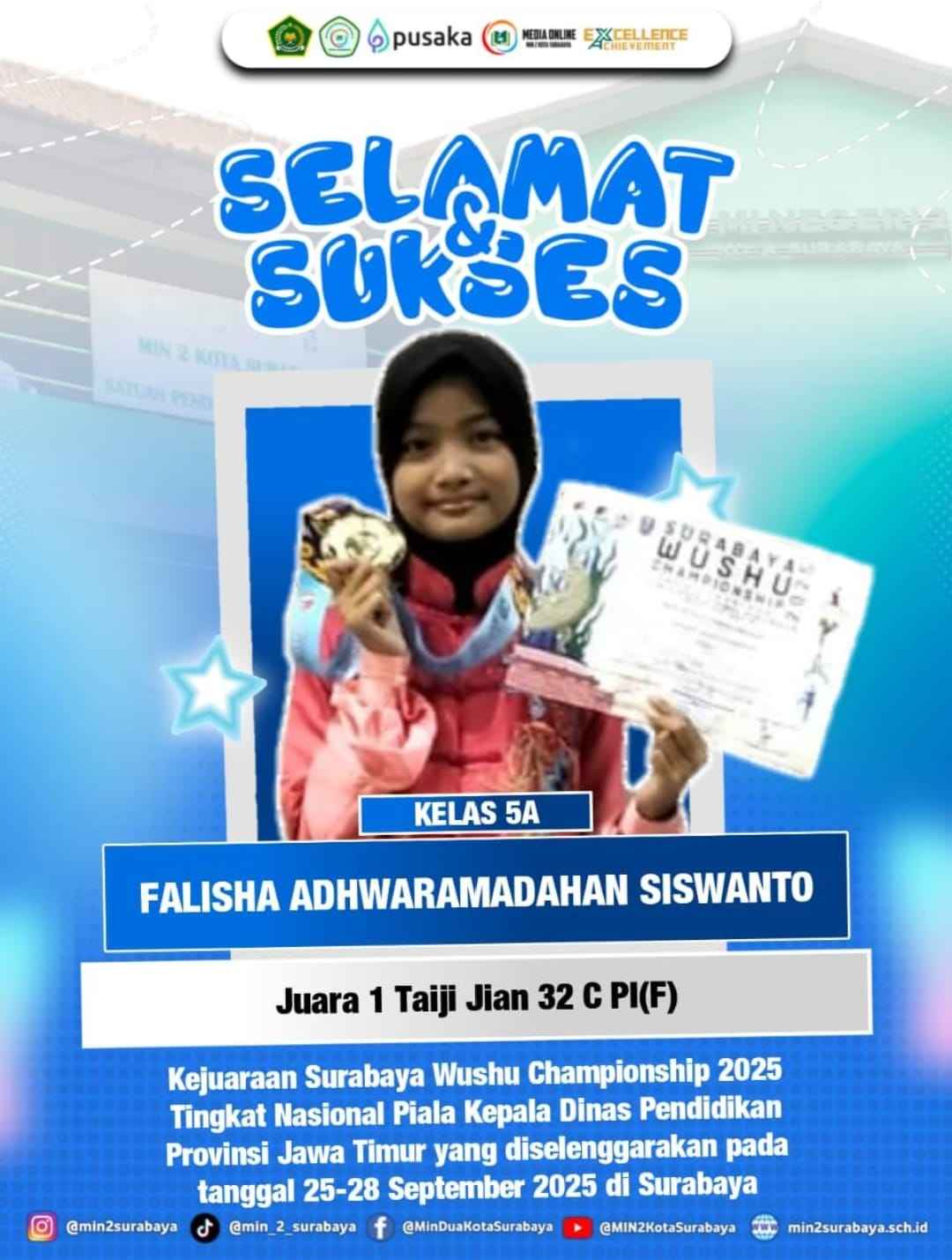 | FALISHA ADHWARAMADHAN SISWANTO | 0148583527 | Juara 1 Taiji Jian 32 C PI (F) Wushu Championship | Tingkat Nasional | 2025 | Foto | |