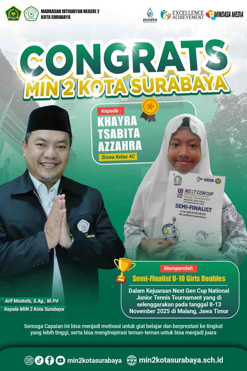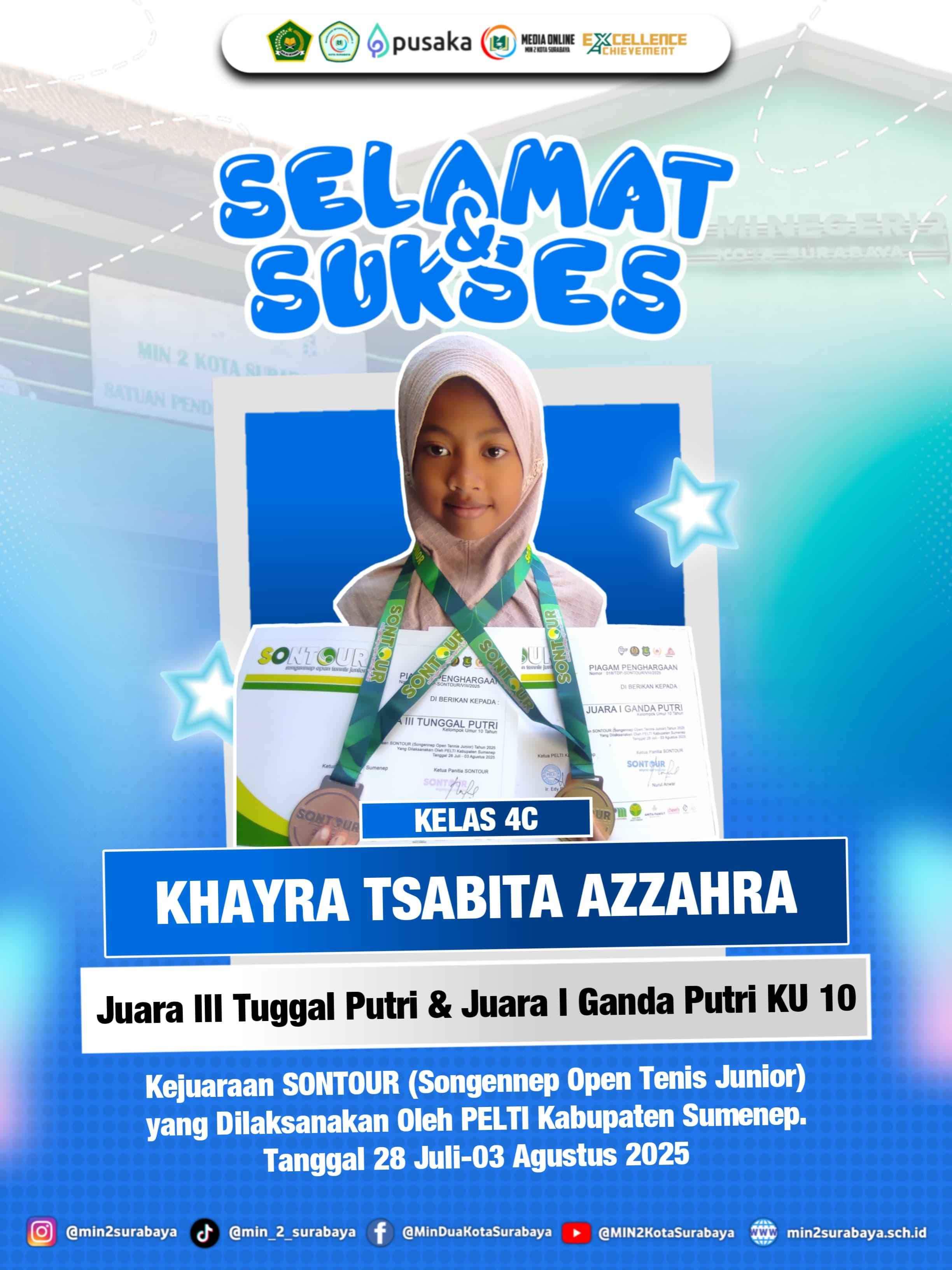 | KHAYRA TSABITA AZZAHRA | 3163684696 | Juara 3 Tunggal Putri (Kejuaraan Songennep Open Tennis Junior) | Tingkat Provinsi | 2025 | Foto | |